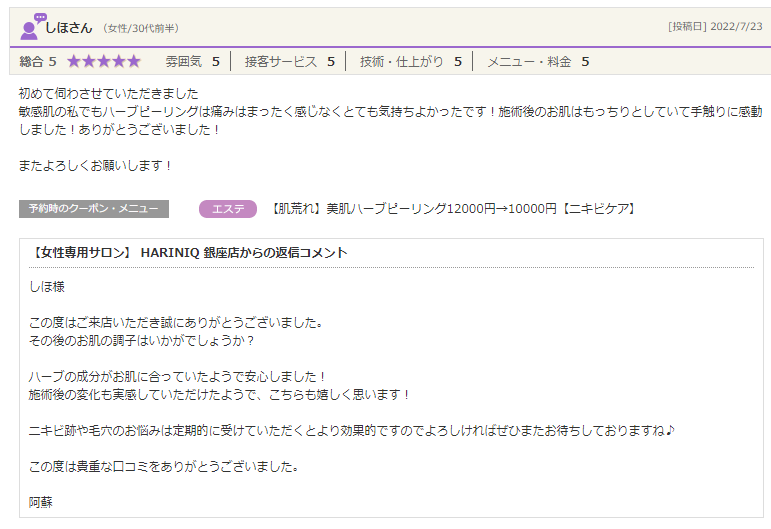 敏感肌の私でもハーブピーリングは痛みはまったく感じなくとても気持ちよかったです!施術後のお肌はもっちりとしていて手触りに感動しました!ありがとうございました!またよろしくお願いします!』