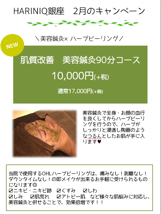肌質改善美容鍼灸90分コースが、2月中はこの価格で受けられます\(◎o◎)/