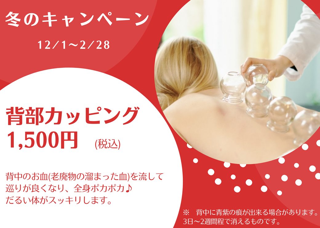 12月1日から2月28日まで、このデトックス効果の高いカッピングを特別価格1,500円(税込)でお得にお受けいただけます。