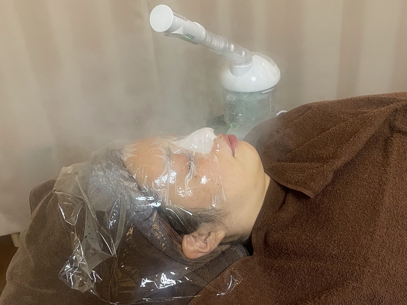 スチーマーでお顔を温めながら、毛穴を開かせていきます。